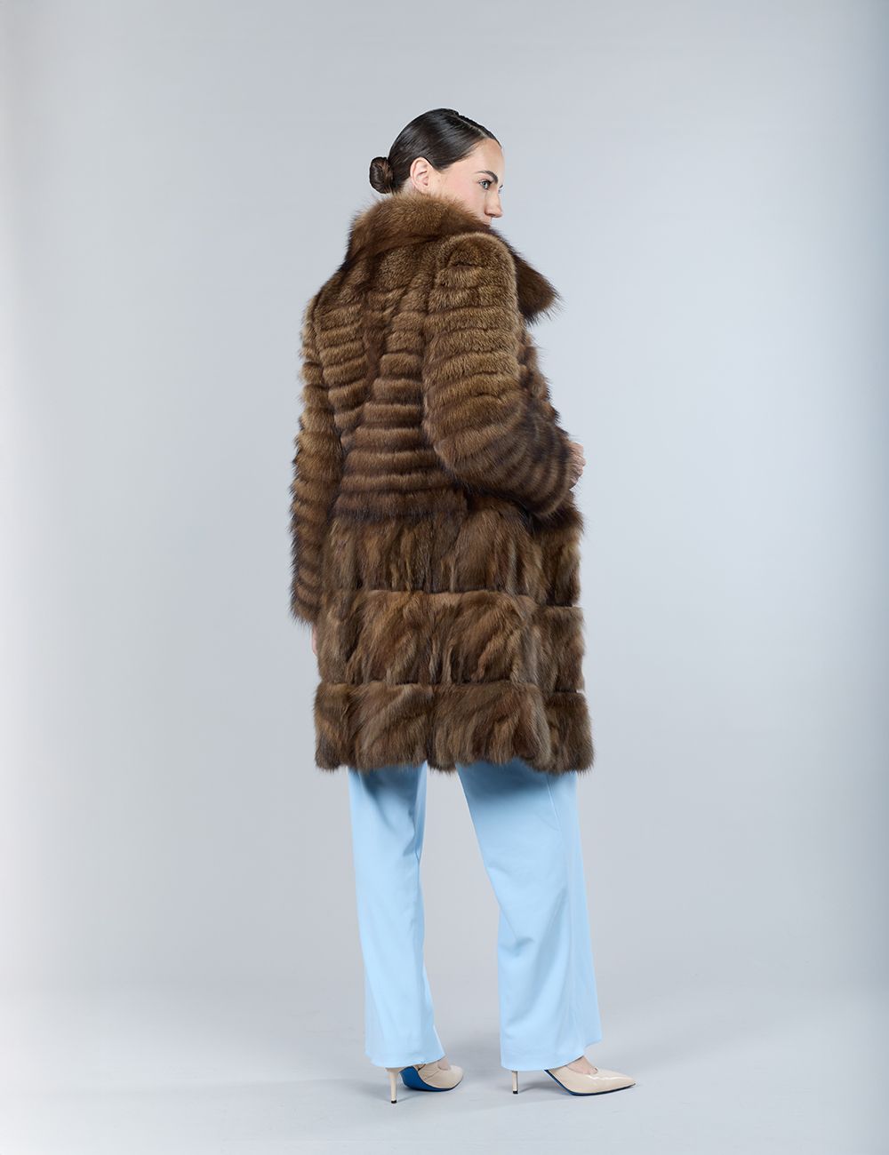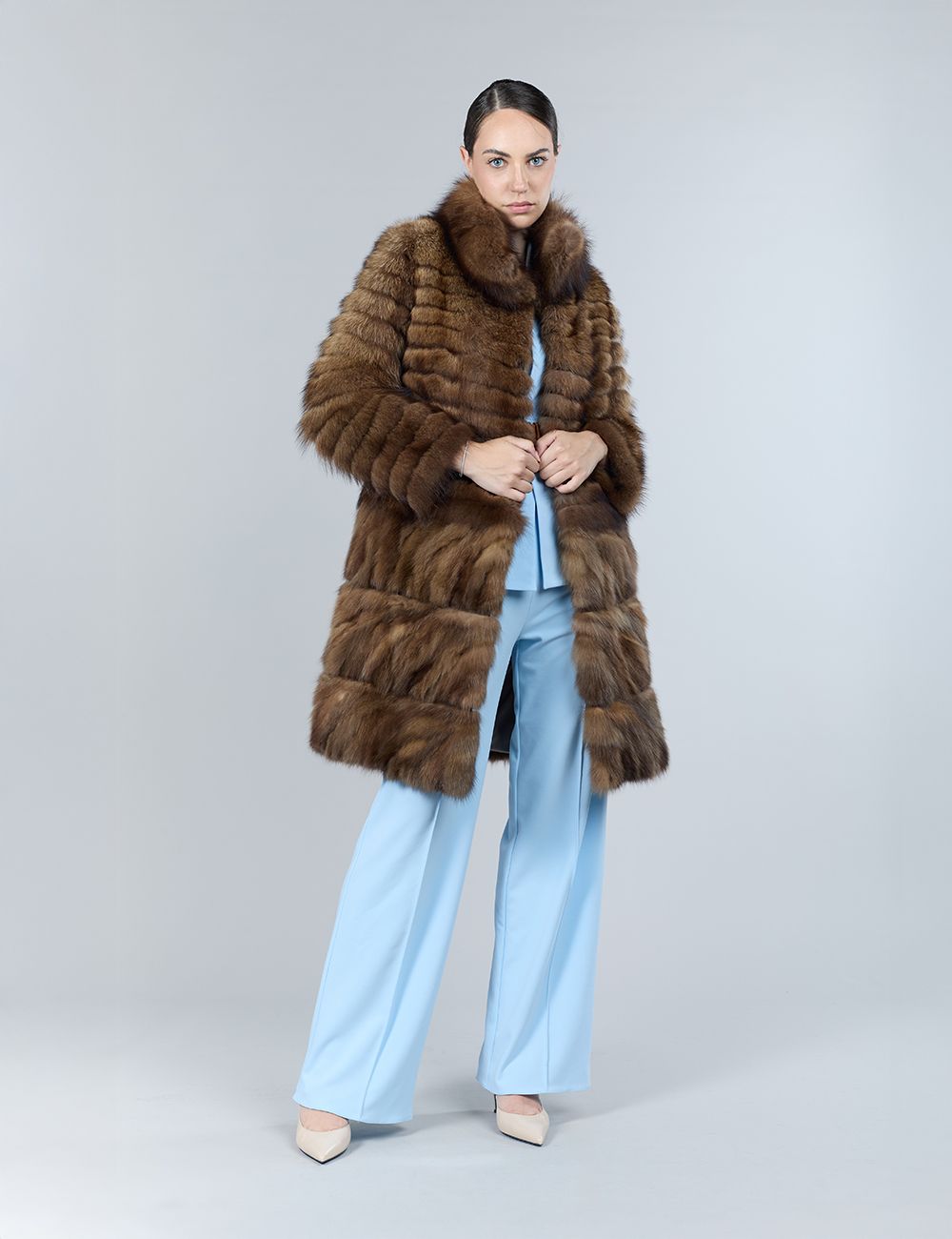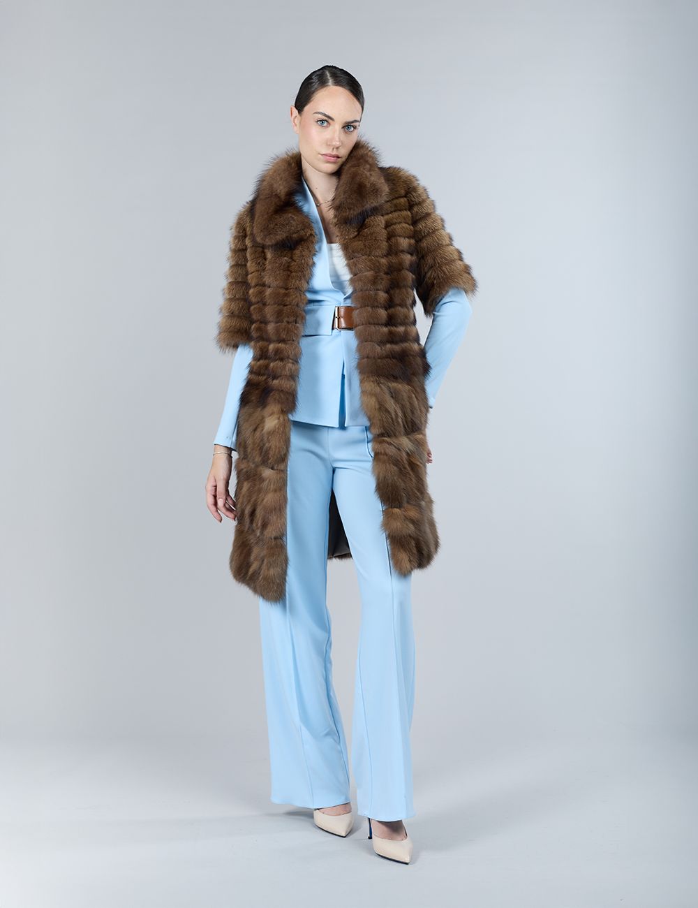 Cappotto in pelliccia di marmotta beige con collo in zibellino e maniche lunghe. La parte inferiore è staccabile e può essere indossata come elegante accessorio sulle spalle o intorno al collo, 90 cm