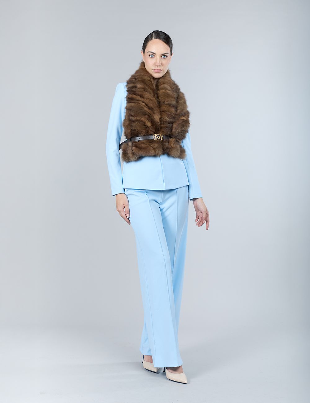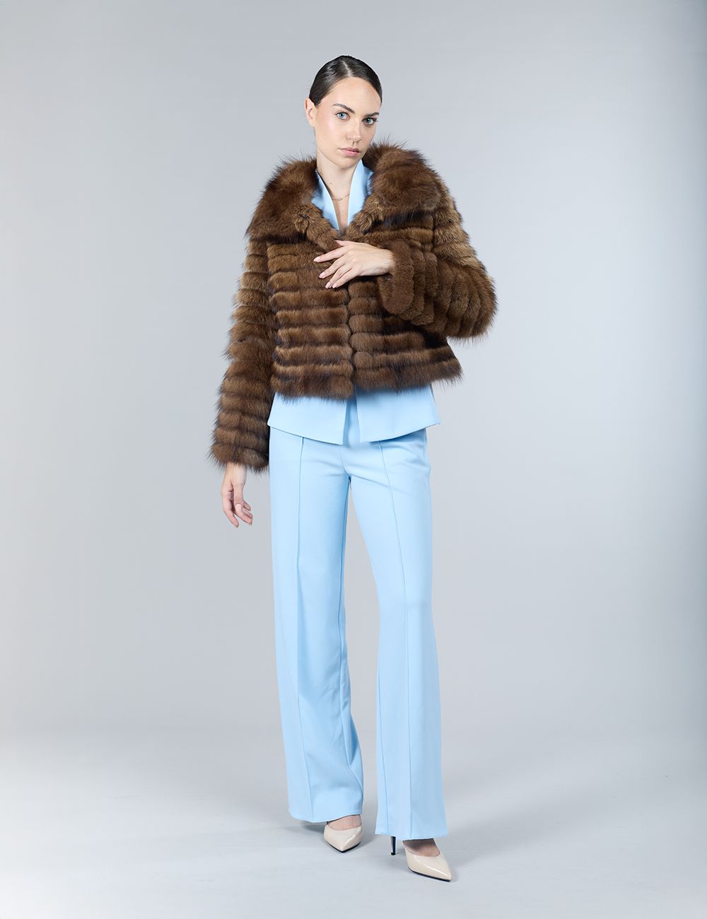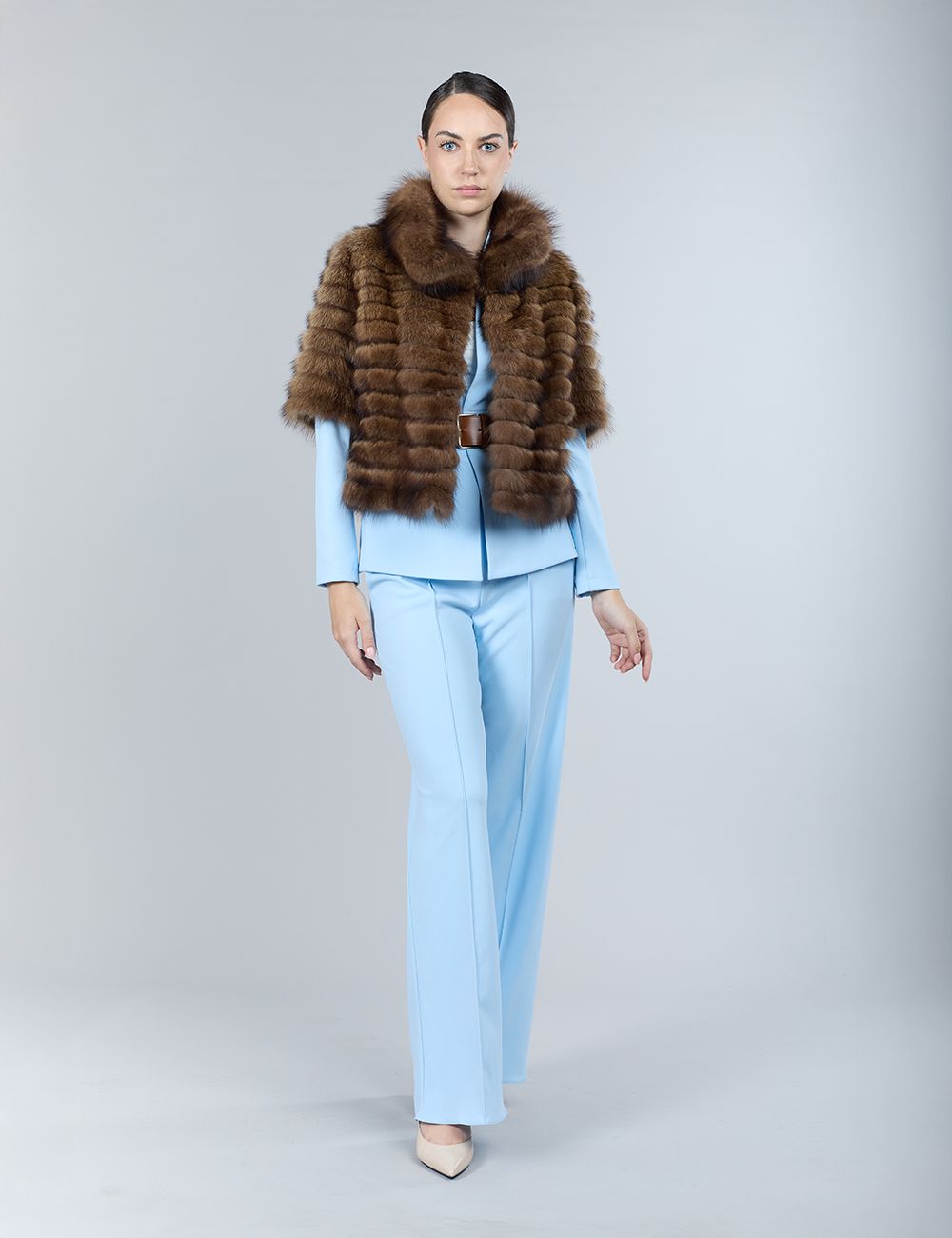 Cappotto in pelliccia di marmotta beige con collo in zibellino e maniche lunghe. La parte inferiore è staccabile e può essere indossata come elegante accessorio sulle spalle o intorno al collo, 90 cm