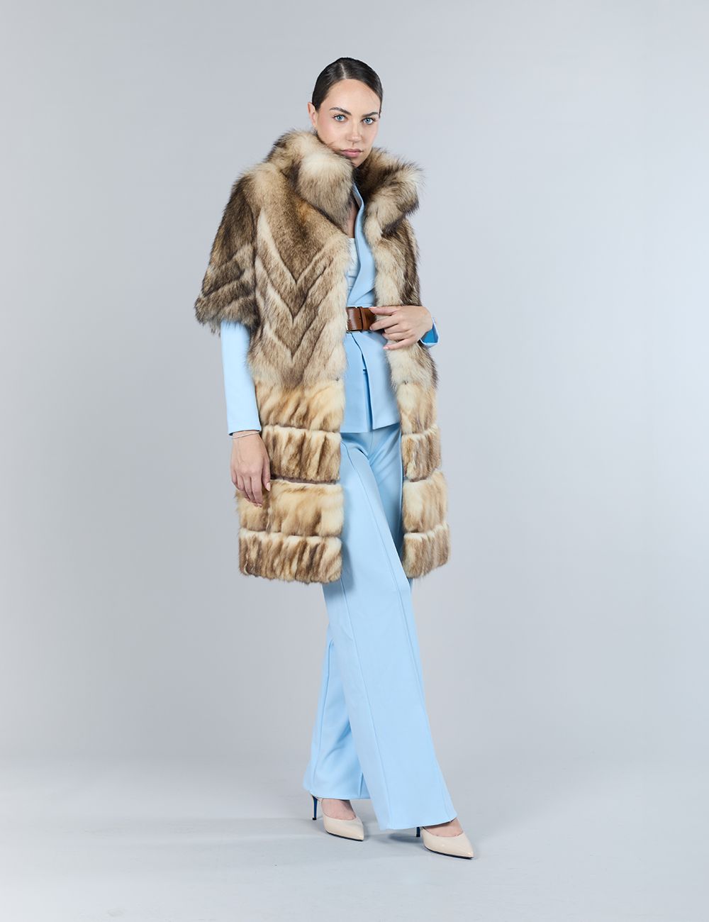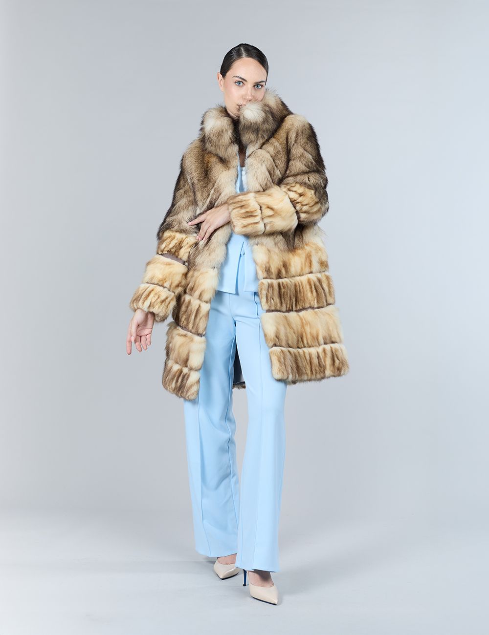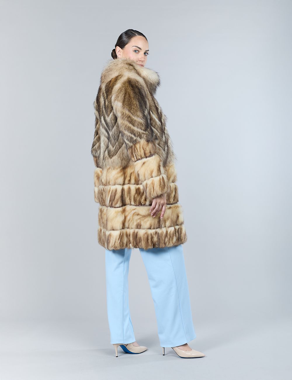 Cappotto in pekan naturale, con parte inferiore staccabile e collo in zibellino, 90 cm