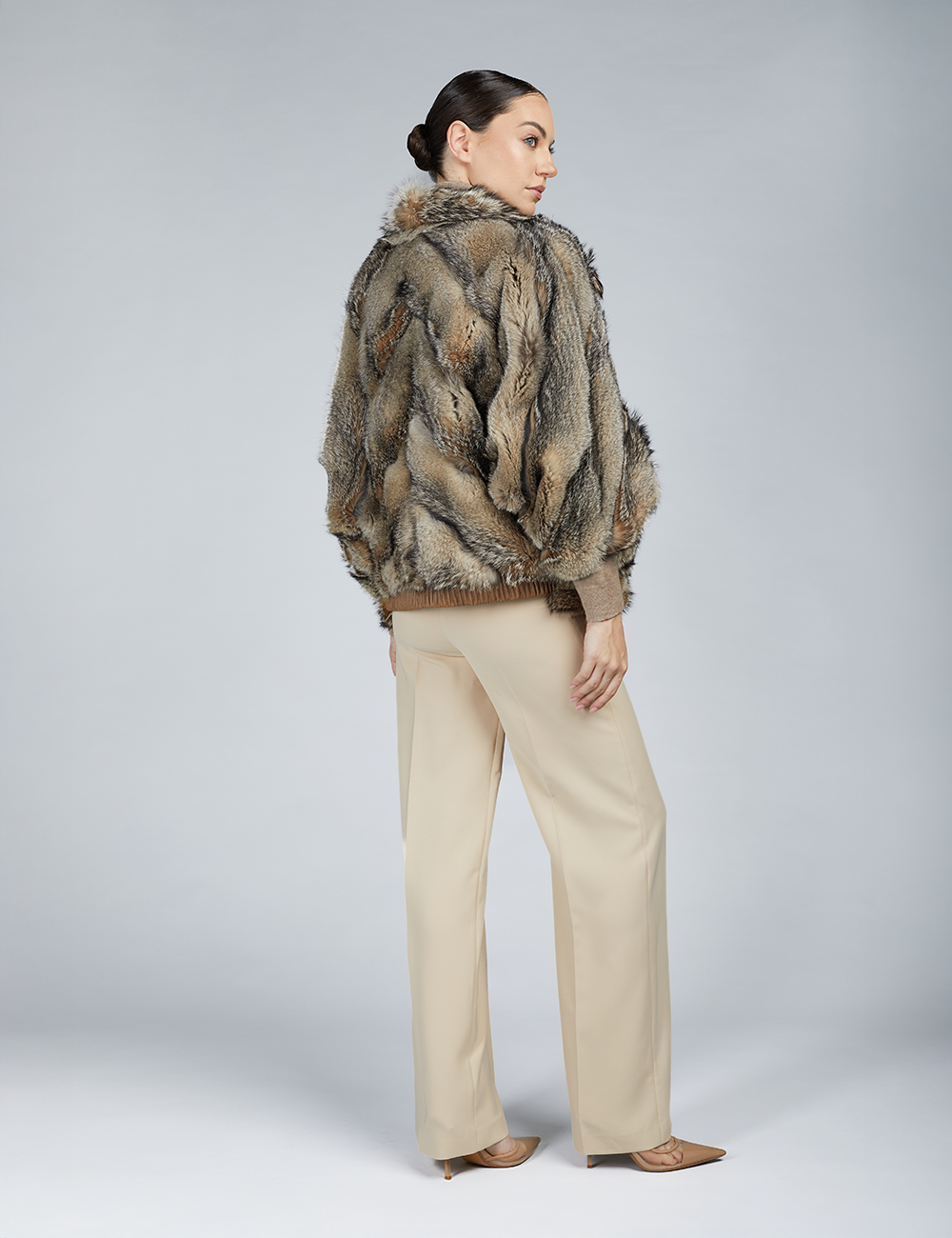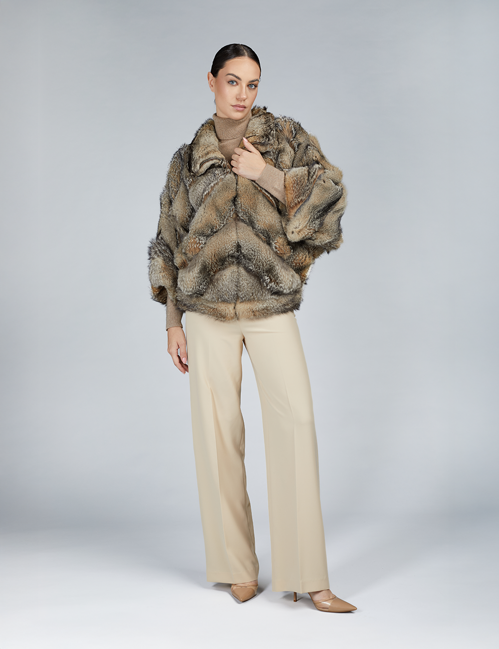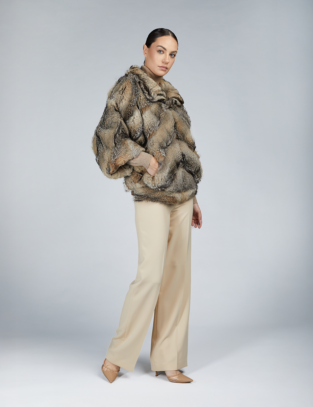 Giacca corta in volpe patagonia, piccolo collo, chiusura a ganci, manica ampia, naturale, 60cm