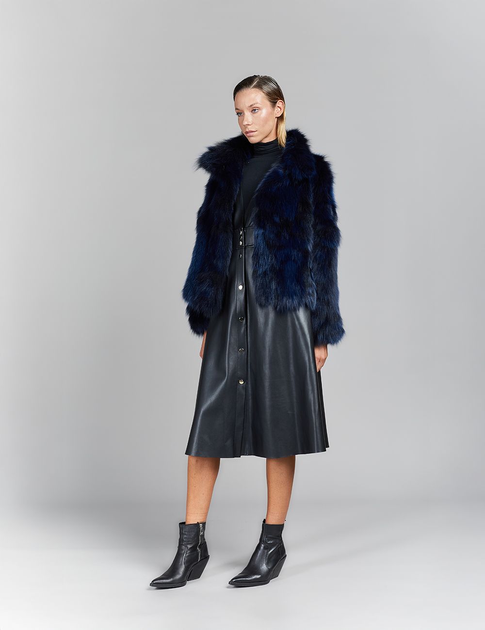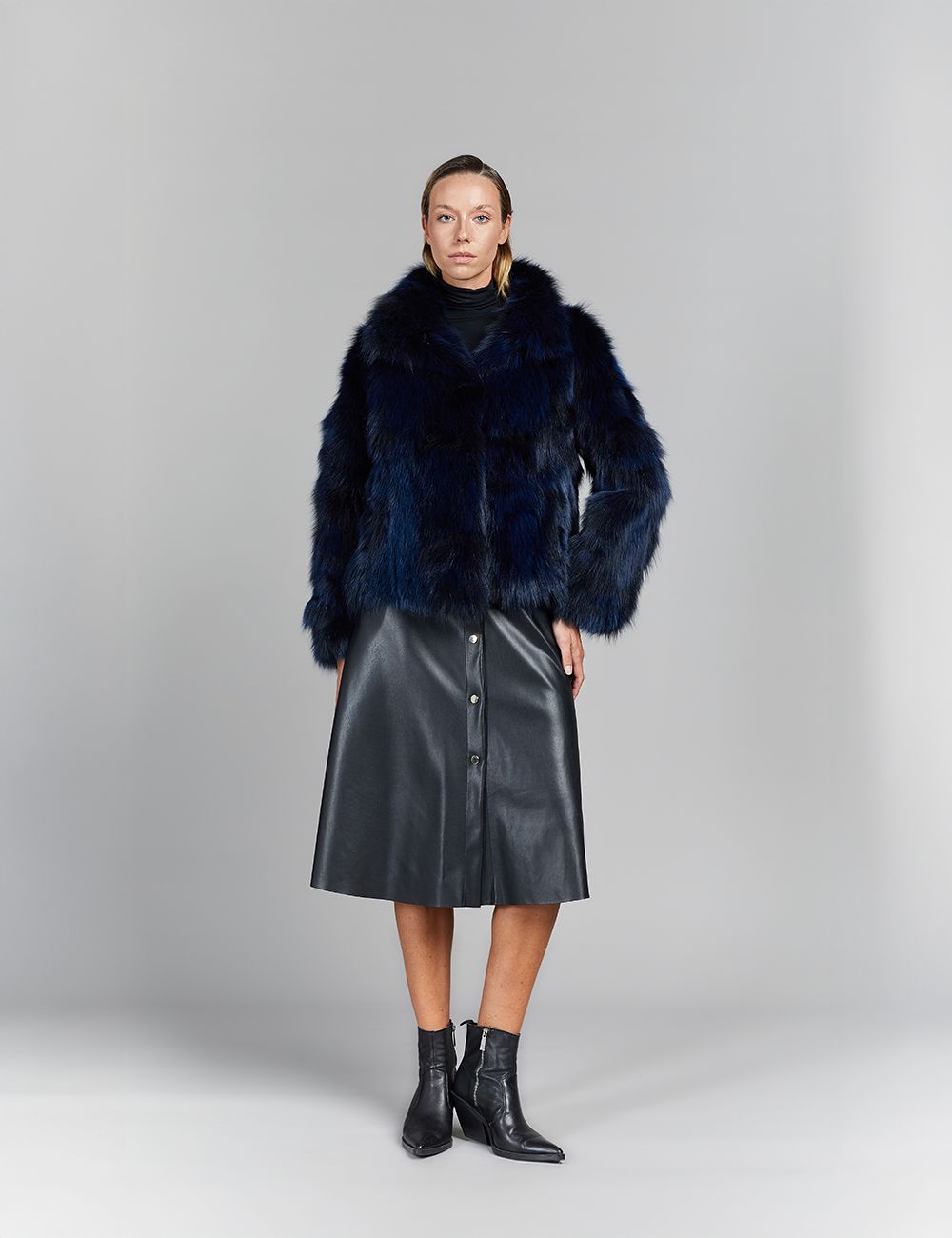 Giacca in volpe, collo alto, chiusura a ganci, blu, 55 cm