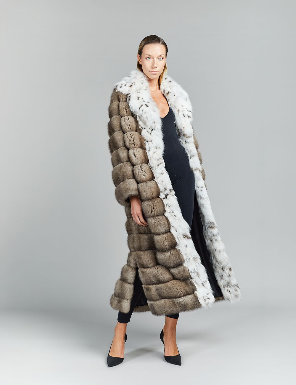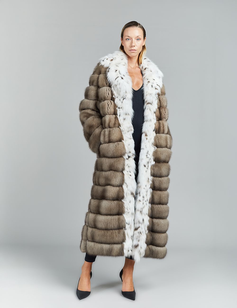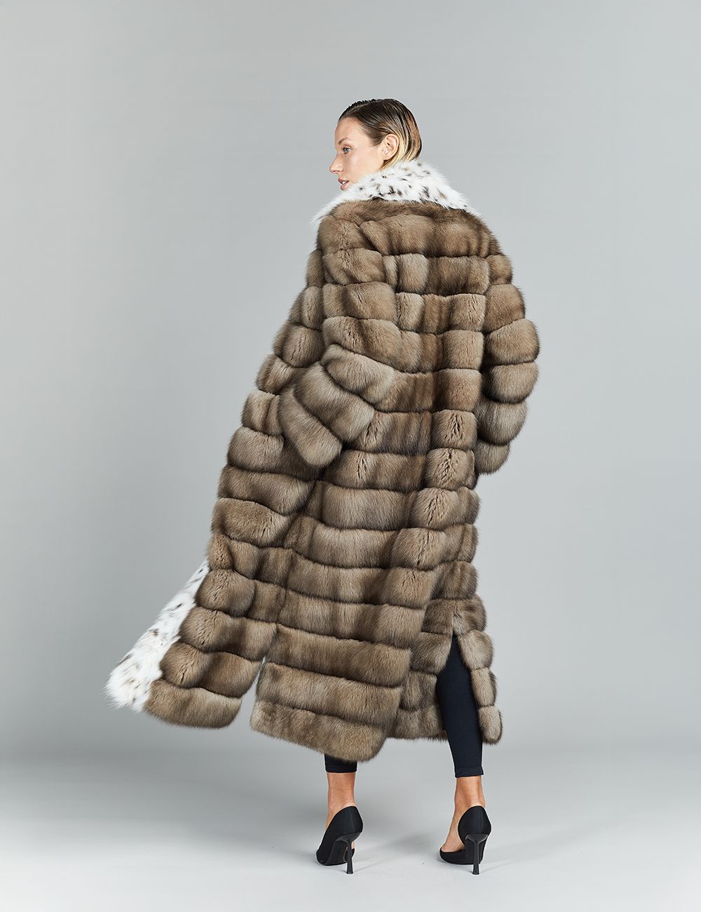 Cappotto in zibellino con collo in lince, tortora, 125 cm