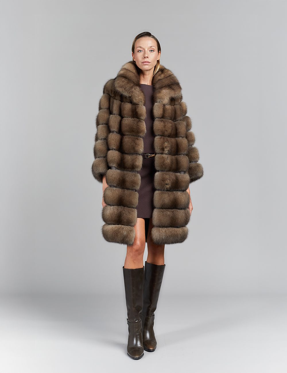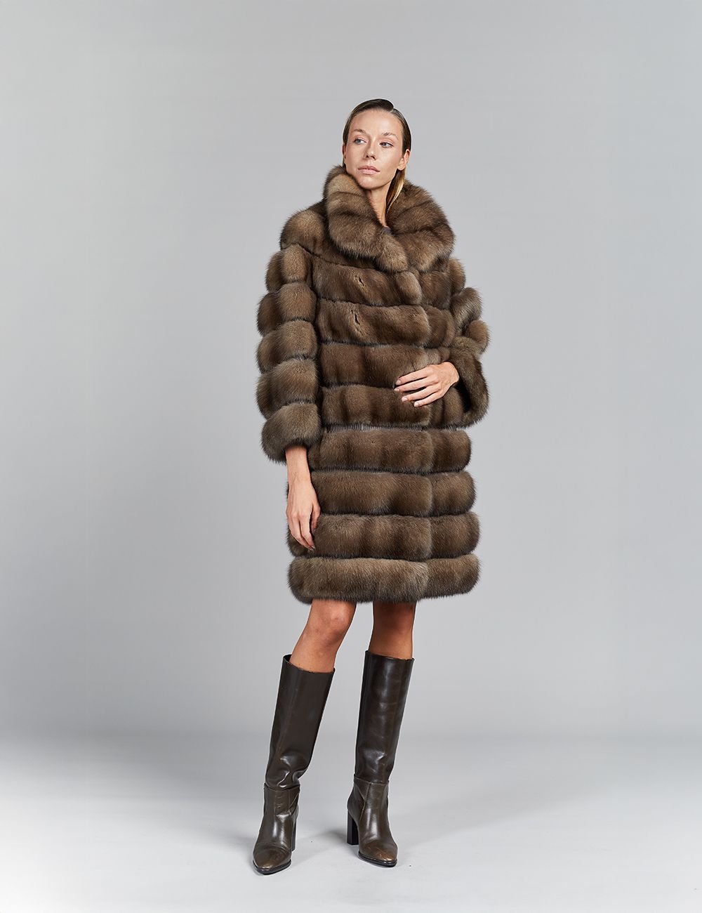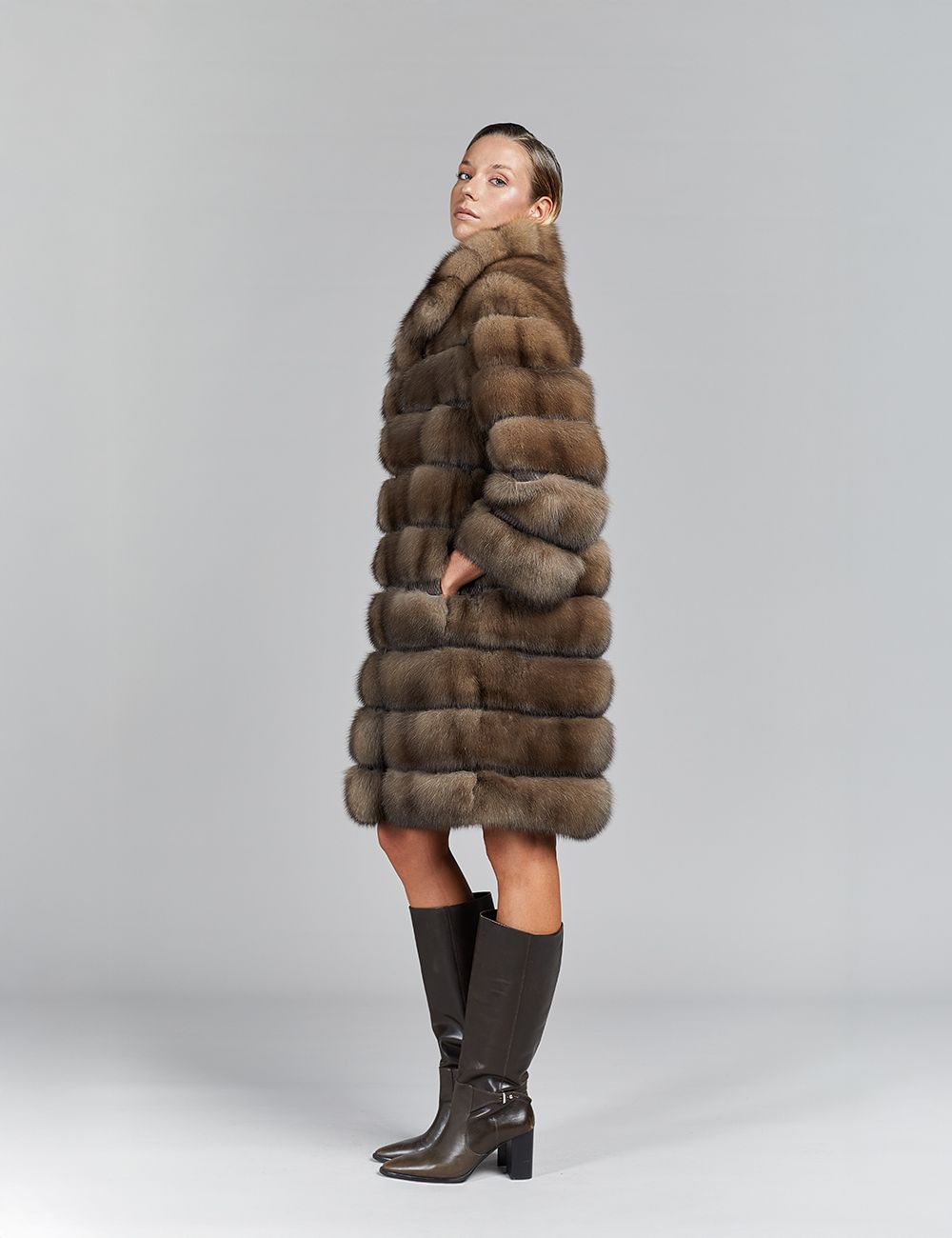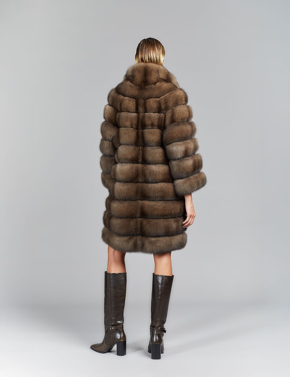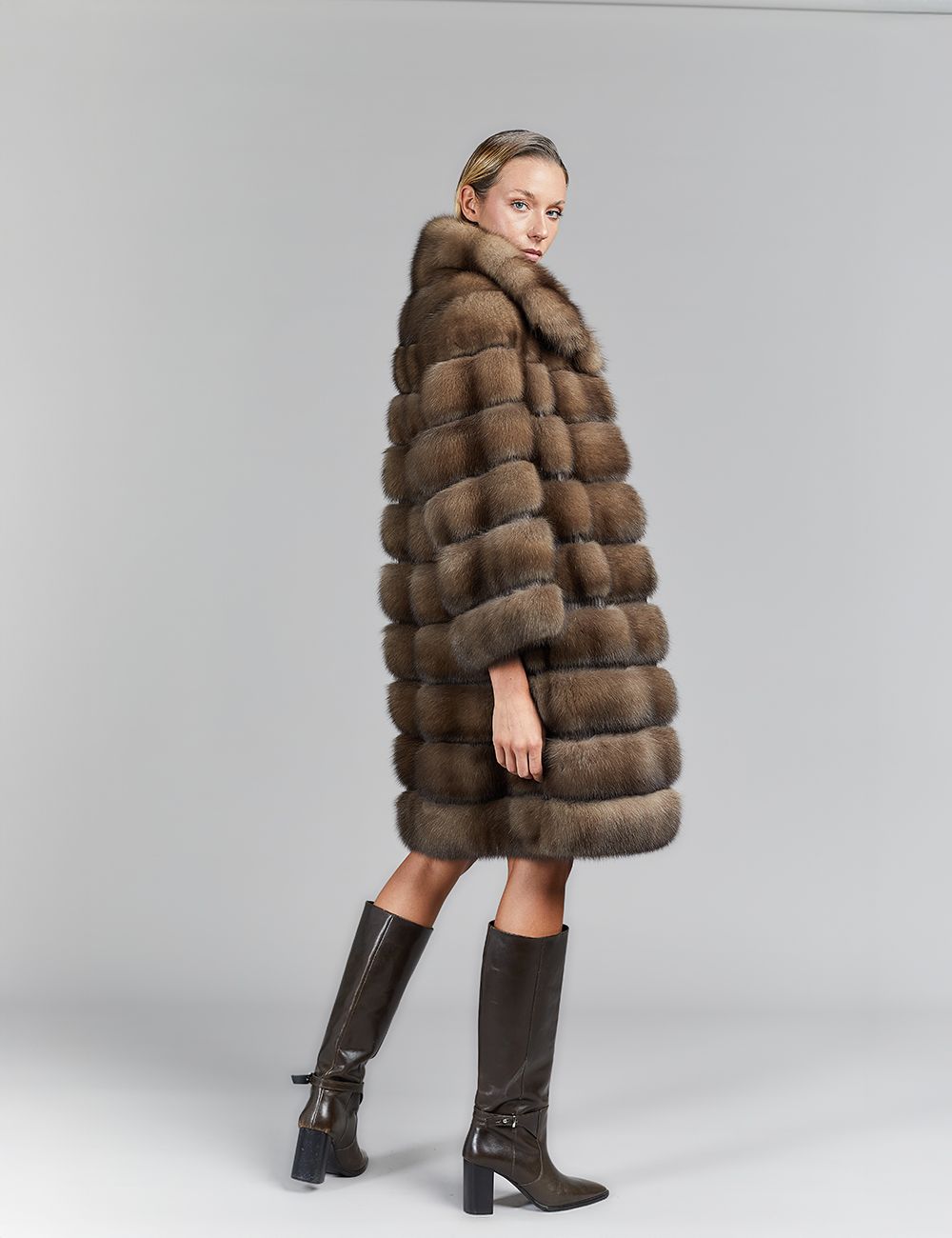 Cappotto lungo in zibellino, con collo alto, colore tortora, 95 cm