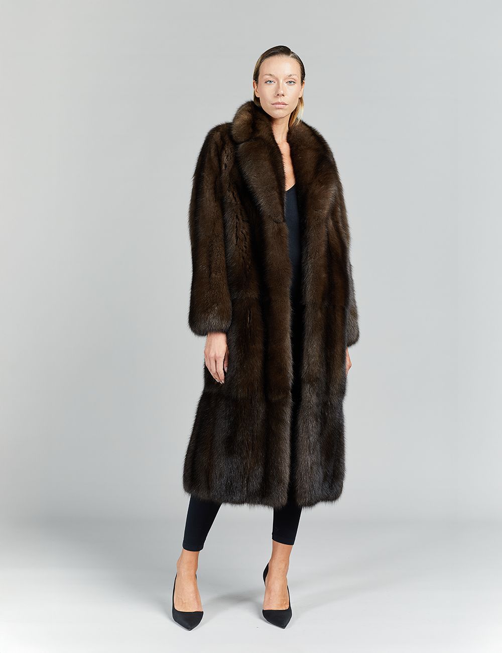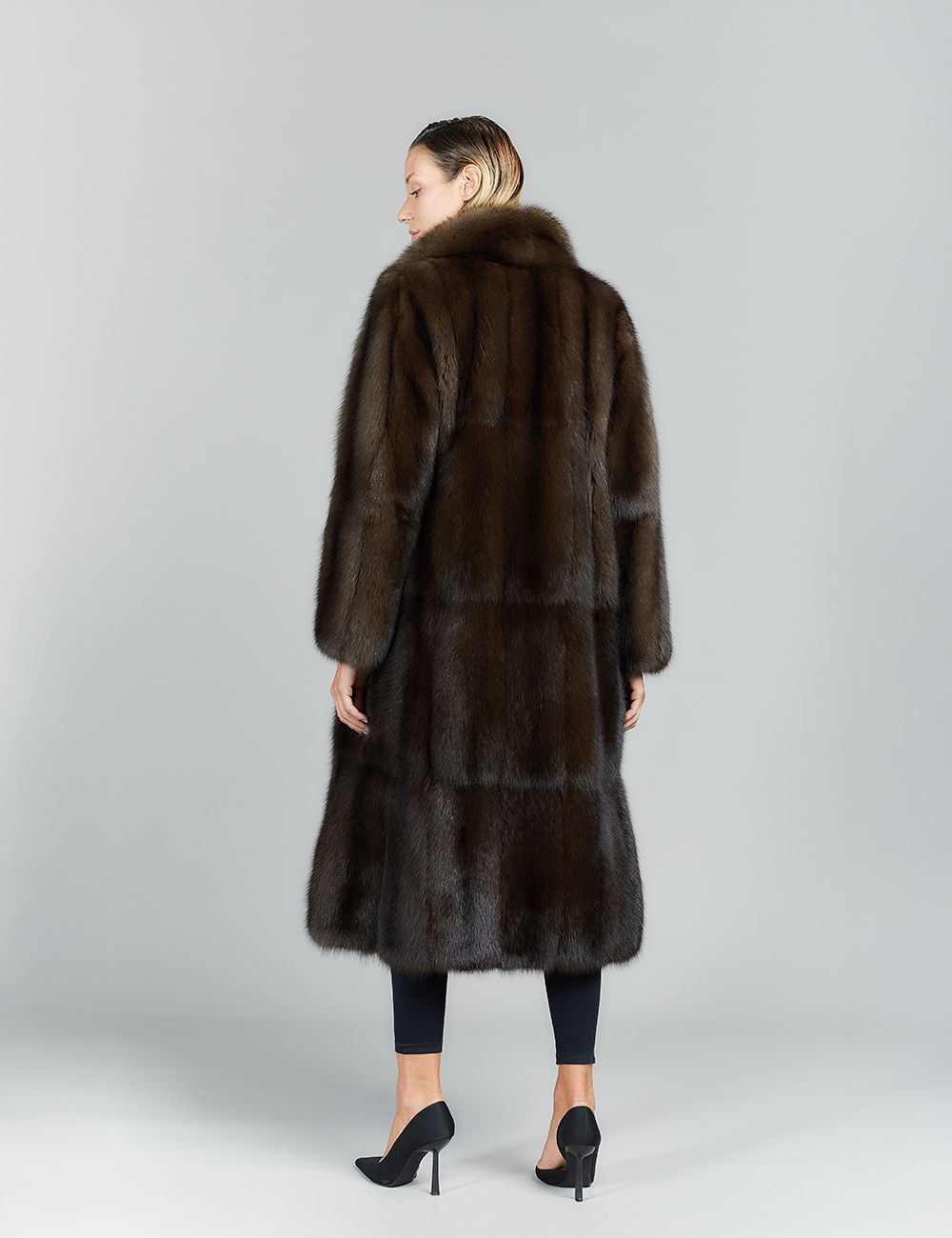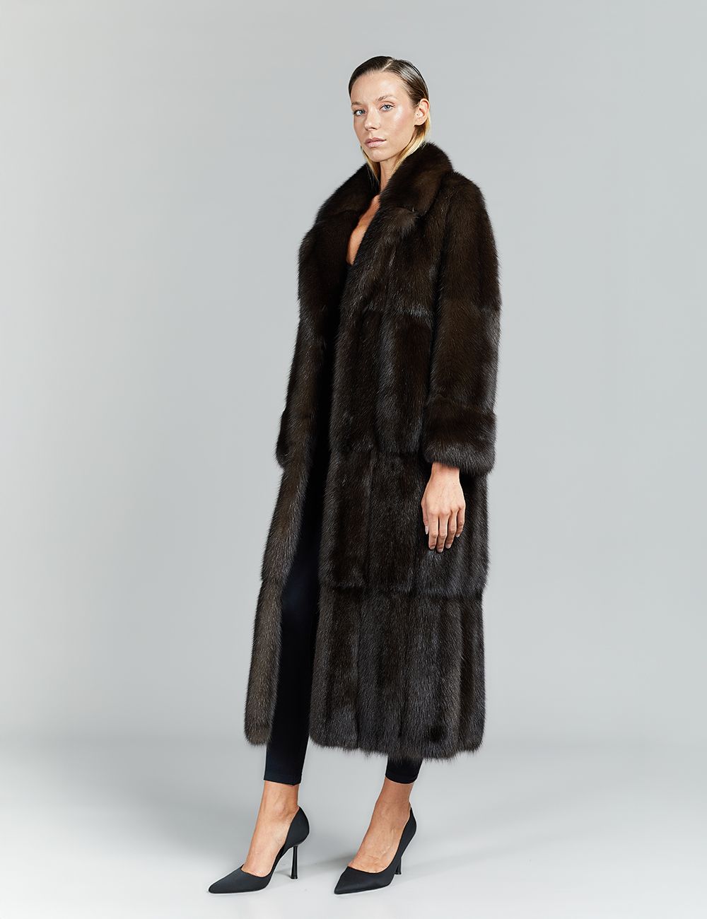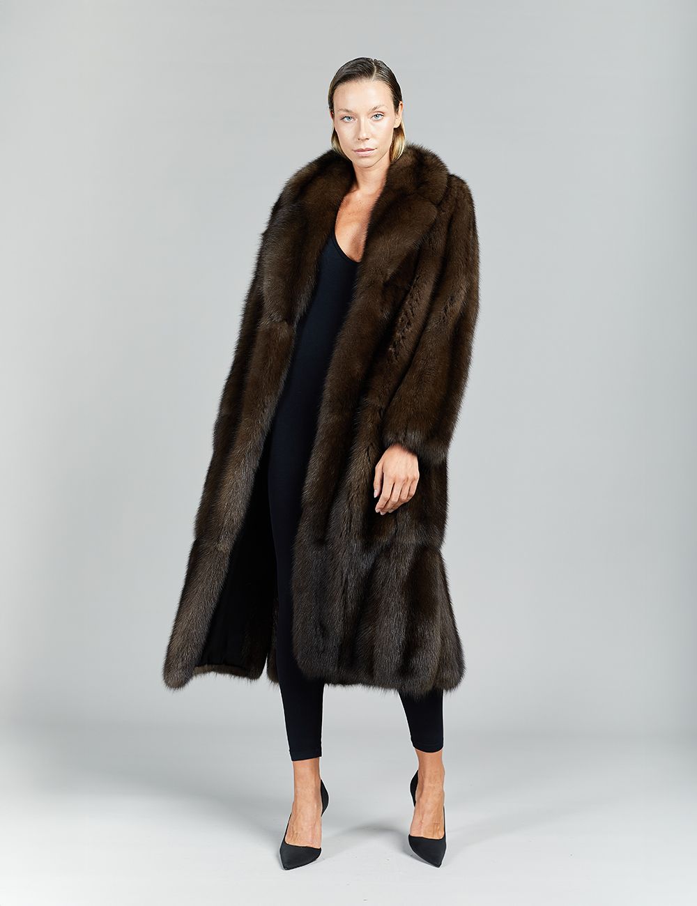 Cappotto lungo in zibellino, con collo inglese, a pelle intera, dark brown, 125 cm