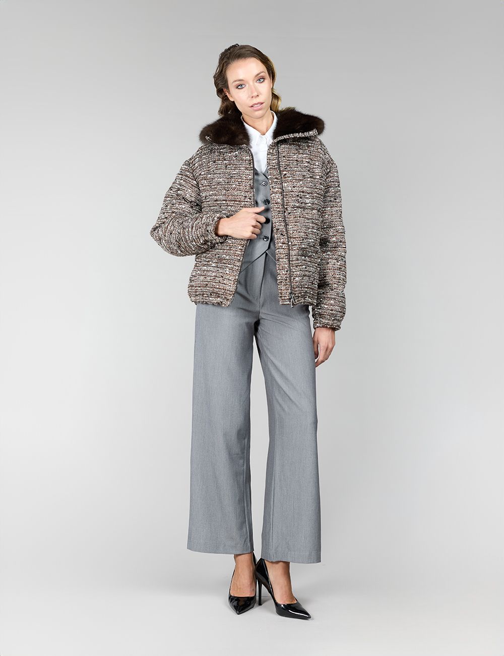 Cappotto in tessuto bouclé marrone con ampi revers e bordi in zibellino silver blue, chiusura con ganci e tasche applicate, 115 cm