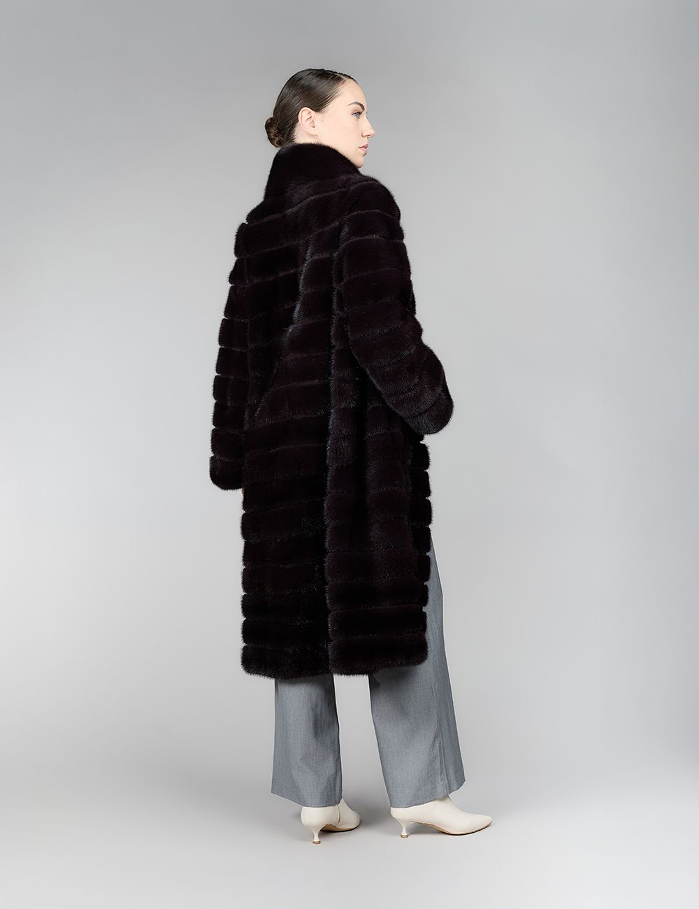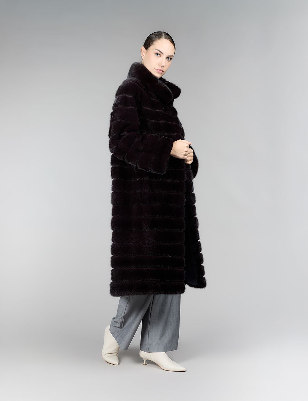 Длинное пальто из норки с воротником стойкой, горизонтальная отделка, баклажановый цвет, 110 см