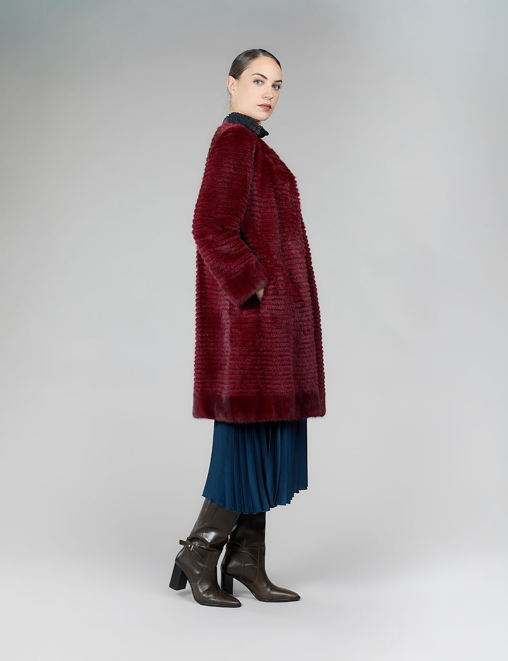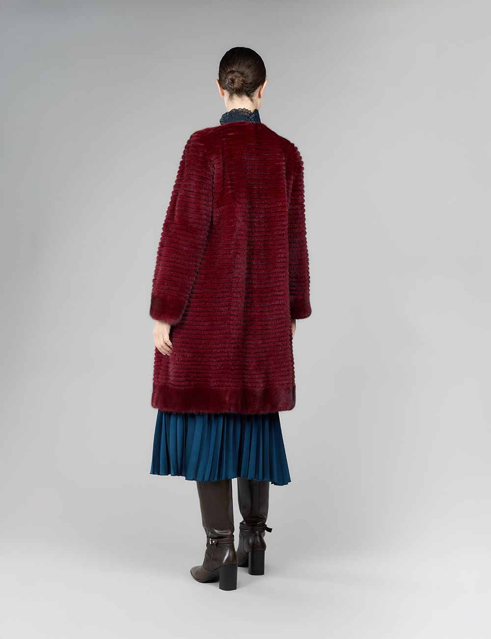 Пальто из норки с продольной отделкой, без воротника, прямого кроя, красный цвет, 90 см