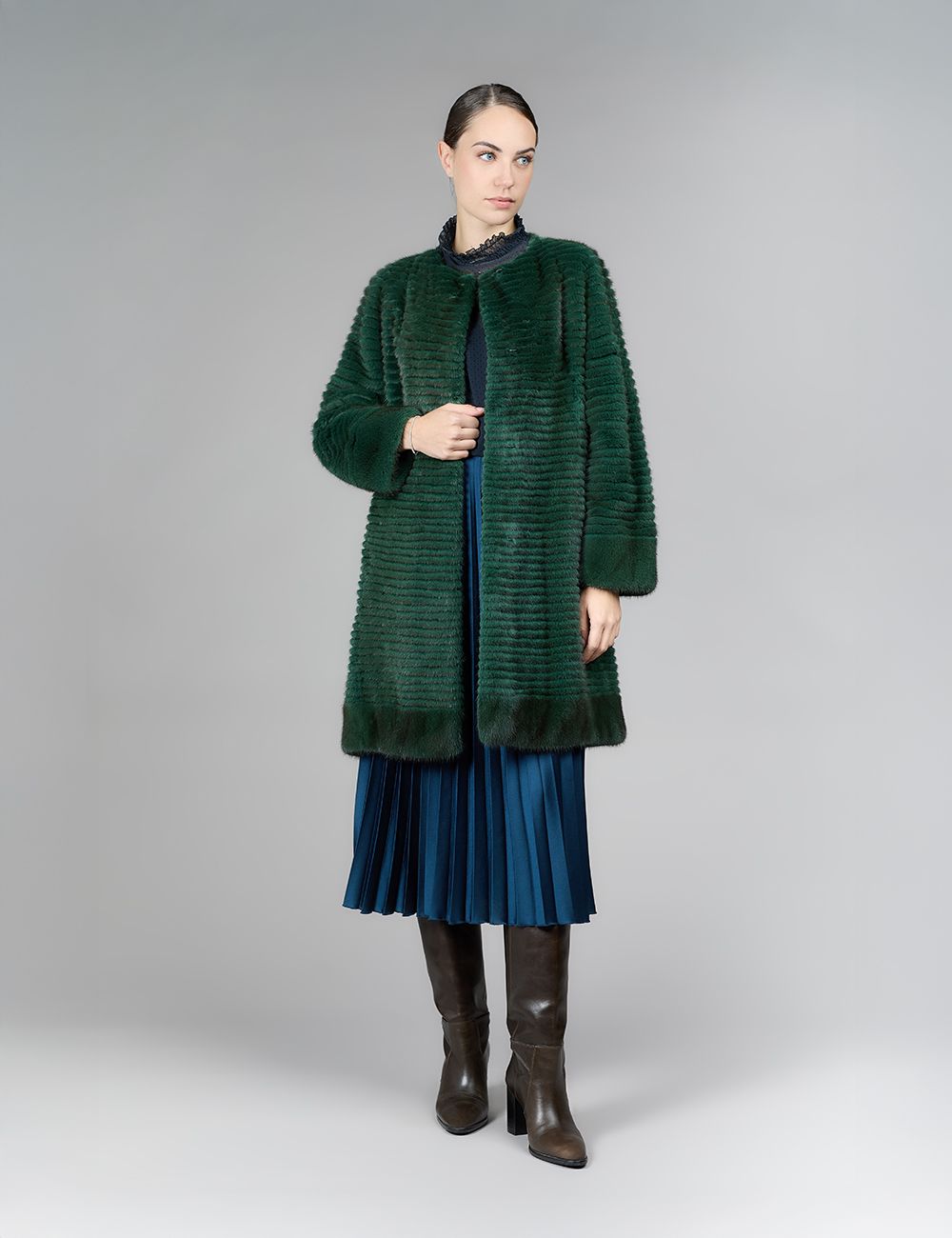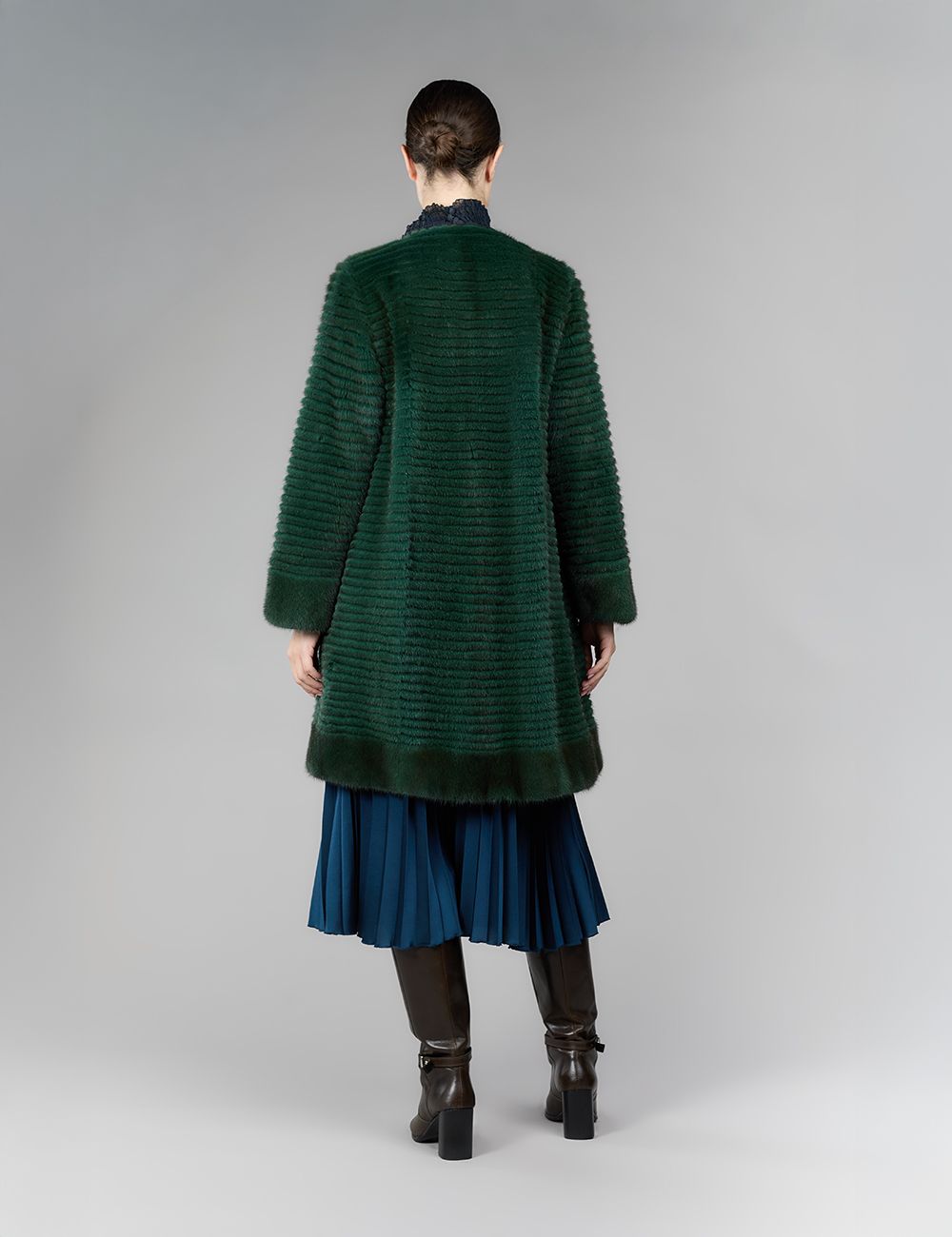 Пальто из норки с продольной отделкой, без воротника, прямого кроя, цвет зеленый, 90 см