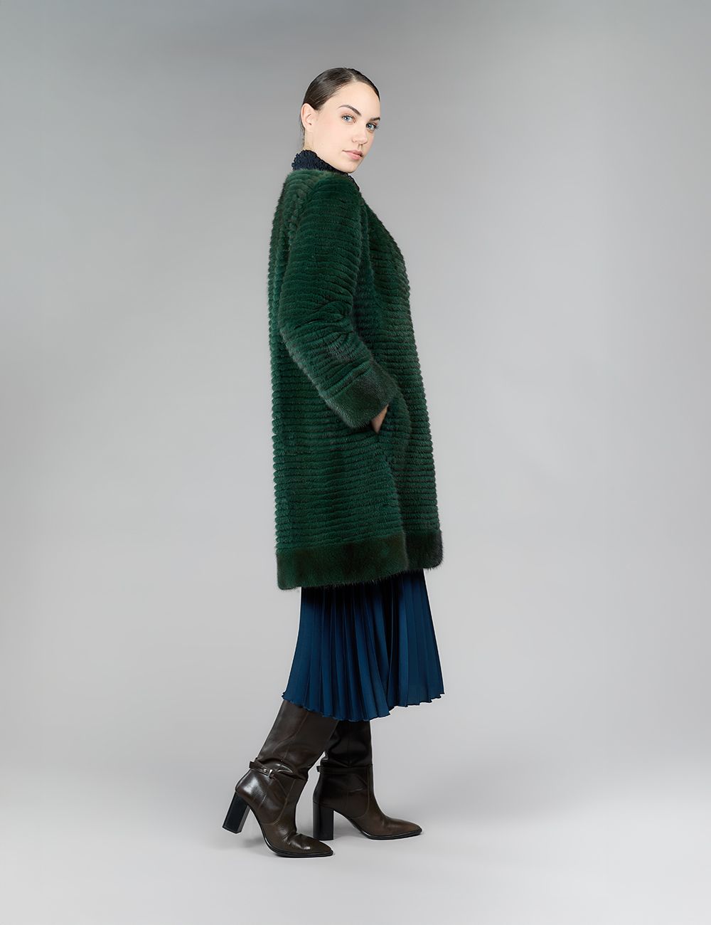 Пальто из норки с продольной отделкой, без воротника, цвет зеленый, 90 см